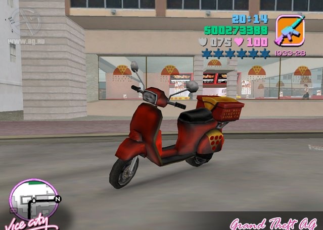 В Vice City мотоцикли представлені наступними моделями: Pizza Boy: швидкість складає 190 км/год, ушкоджуваність становить 11%, тип приводу - задній, тип палива бензин, прискорення / гальмування - 30, керованість на дорозі - 35, віртуальна ціна - $10000, вага - 350 кіло. Варіація Faggio на піцерійну тему. Відрізняється від свого прабатька спеціальною сумкою для перевезення піци і розфарбуванням. Ну і, так, на цьому мопеді ти можеш розвозити відому італійську страву